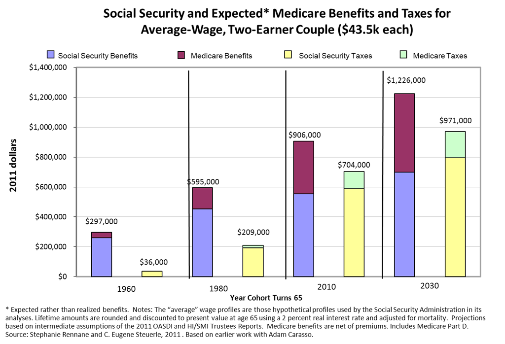 According to an Urban Institute research paper, in 2011 a two-earner couple retiring with a combined income of apx. $87,500 (defined as the average wage), would have paid about $116,000 into the Medicare program during their lifetimes. That same couple can expect lifetime Medicare benefits of $357,000 net of premiums. And given the current trajectory, in 2030 an average-earning couple will pay $175,000 in Medicare taxes but receive a benefit of $527,000.
